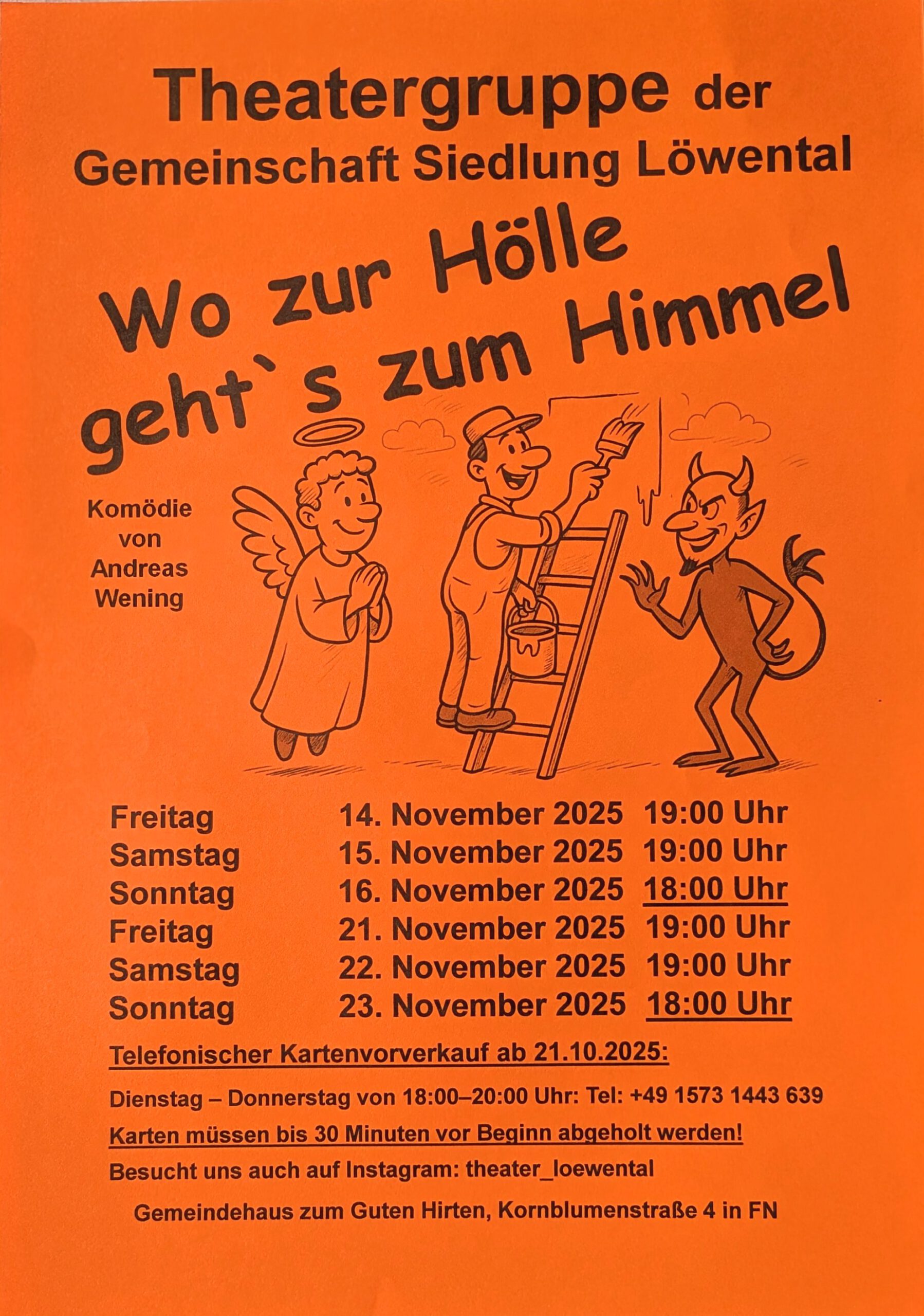 | 14.11. – 16.11.2025 + 21.11. – 23.11.2025 | Theaterstück „Wo zur Hölle geht’s zum Himmel?“ – Komödie von Andreas Wening Karten-Reservierung ab dem 21.10.2025 von Dienstag – Donnerstag von 18:00 – 20:00 Uhr telefonisch unter der Nummer +49 1573 1443 639 | Gemeindehaus Zum Guten Hirten |